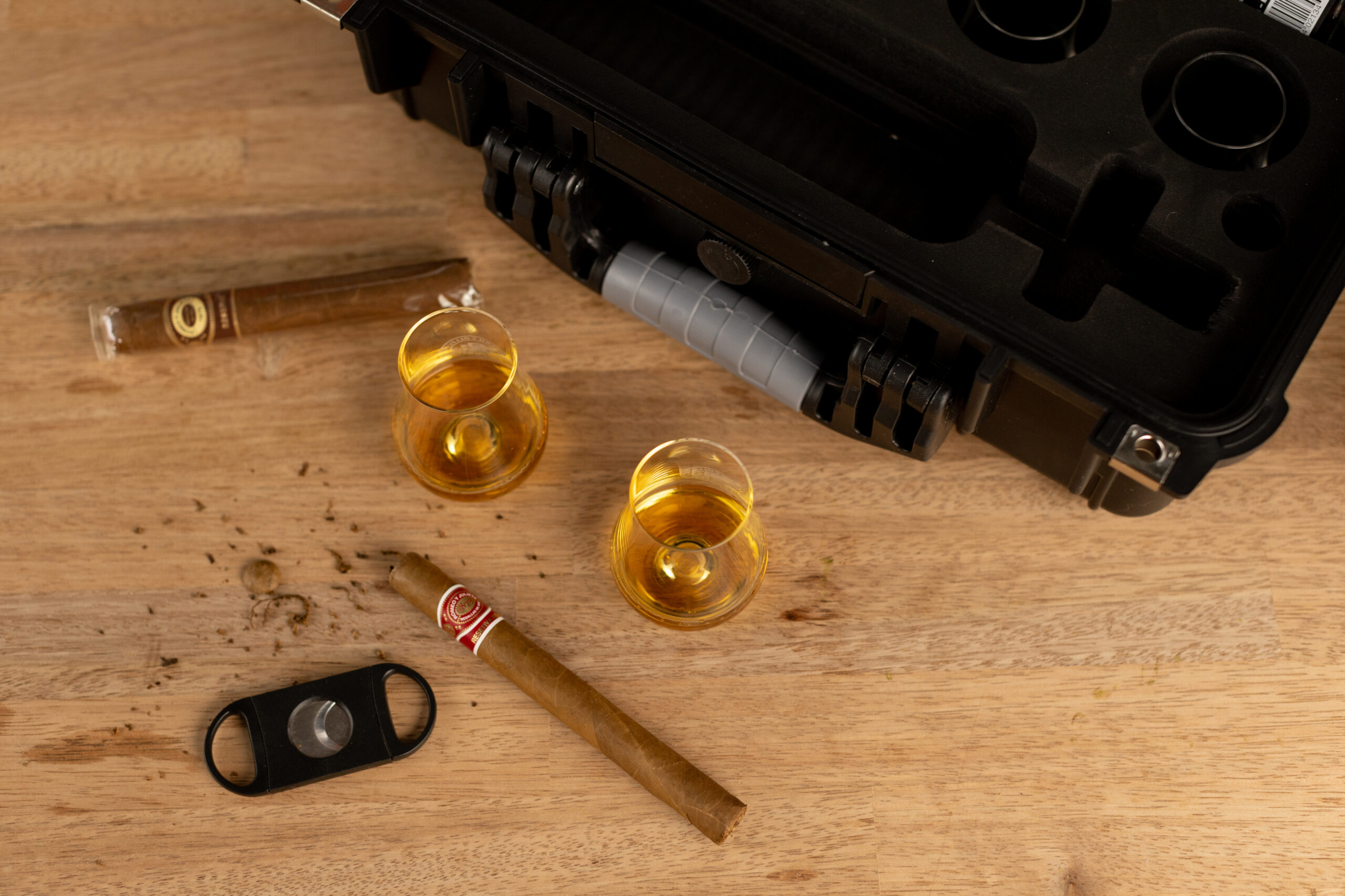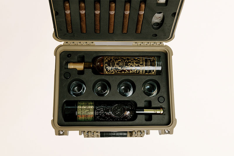 The case is made of a durable hard plastic exterior that is able to withstand the rigors of travel, including bumps, drops, and other impacts. Inside, the case is lined with hard foam padding that is custom-cut to fit bottles of bourbon, cigars, glencairns, cigar cutters and lighters snugly. This hard rigid foam protects the bottles/accessories from movement and jarring during transport.